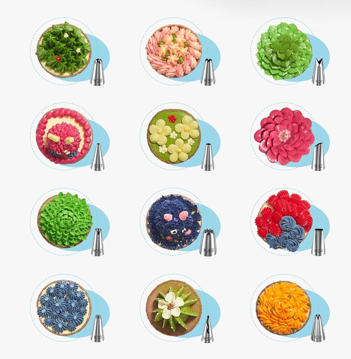 Set uključuje sve što vam je potrebno da započnete ukrašavanje: 36 vrhova za špric, 9 izrezbarenih olovaka za torte, olovku za skidanje, 2 eksera za cveće, 50 kesica za jednokratnu upotrebu, 2 kesice za višekratnu upotrebu, 2 strugača, veliku spojnicu, nož za vađenje kolača, 2 lopatice za glazuru, mešalicu za jaja, makaze i set mernih kašika. Alati su jednostavni za korišćenje i omogućavaju vam da budete kreativni u svakom trenutku. Ovaj komplet je izdržljiv i dugotrajan, pružajući vam dugotrajno zadovoljstvo u ukrašavanju kolača. Odličan je za pravljenje prelepih glazura, rozeta, cveća, užadi, zvezda, listova i drugih dizajna.
